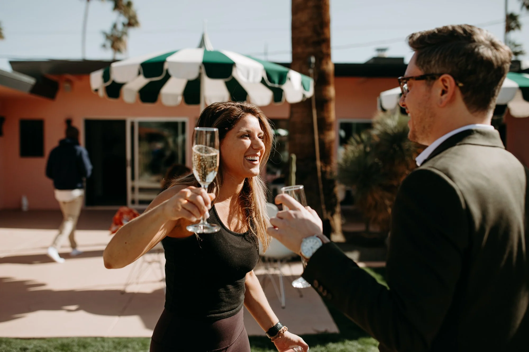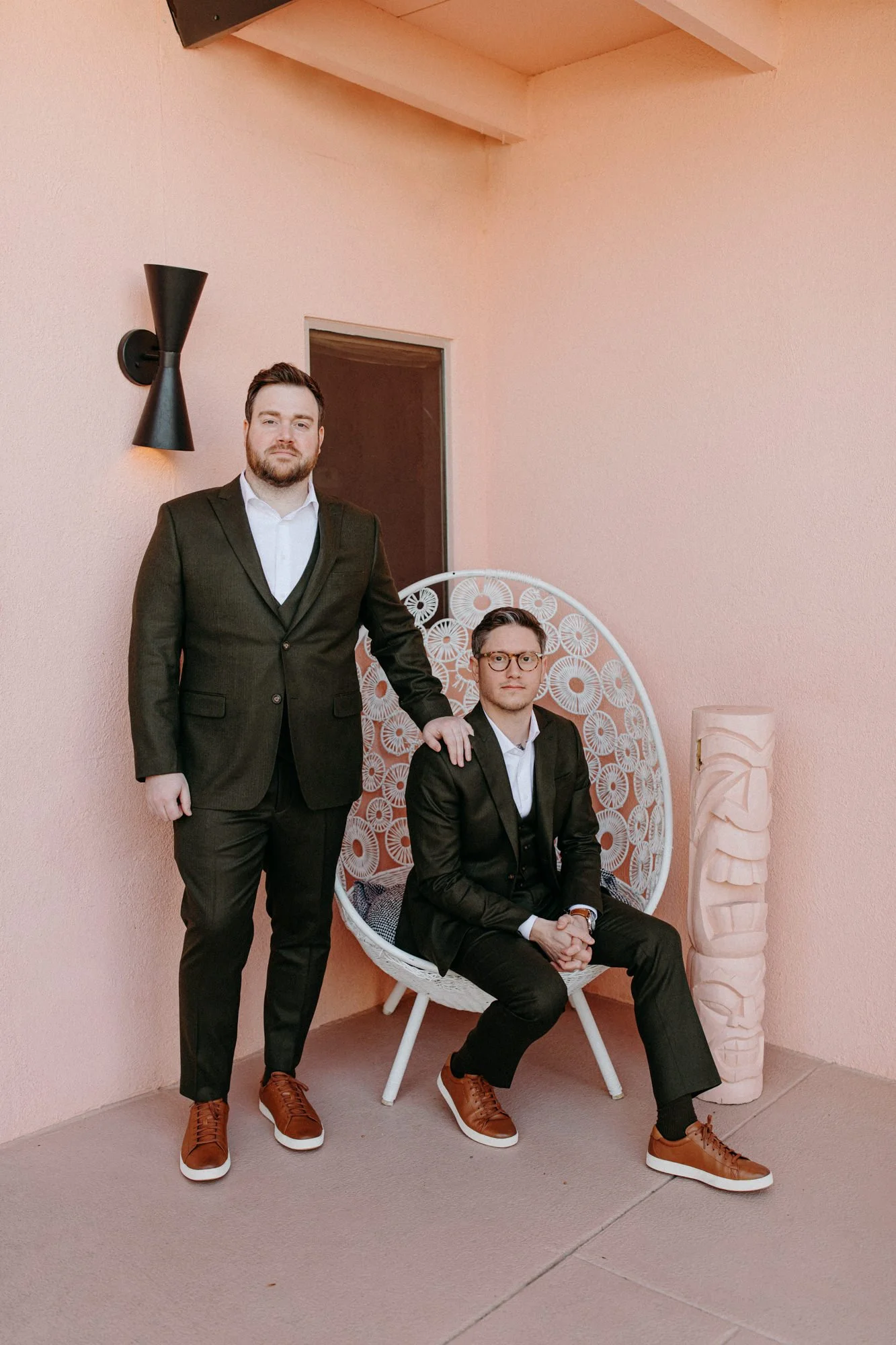 Tucked quietly into the desert of Palm Springs, sits a retro little oasis called The Marley. Brad and Brian chose this funky boutique hotel spot for their Palm Springs elopement as a space to spend downtime with their close friends and family that came along. If you are planning an elopement, consider searching on Airbnb or VRBO for homes that match the vibe you are looking for – whether you are in the mountains looking for something cozy or want a bright, airy bungalow near a beach, I promise you can find the perfect space for you. They serve as an intimate place to make some memories and are also so fun for portrait photos of your day!